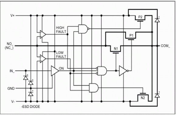 開關內部的兩個比較器用於監視輸入電壓,它們將輸入電壓與電源電壓V+和V-進行比較。當NO (常開)端或NC (常閉)端上的信號位於V+和V-之間時,開關正常工作。當信號電壓超出電源約150mV時(故障情況),輸出電壓(COM)被限製在電源電壓—保持相同極性且輸入為高阻。這是在故障比較器的控製下實現的,它在故障情況下關閉了N1和P1。故障比較器同時還按照以下規則控製鉗位FET (N2和P2):如果開關閉合時出現了負極性故障,接通N2連接COM到V-。如果開關閉合時出現了正極性故障,則接通P2連接COM到V+。如果開關開路時出現了故障,則輸出呈現高阻。