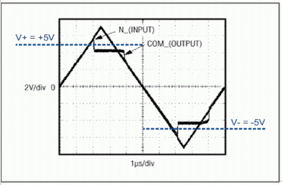 圖6顯示了一個閉合的、具有故障保護的開關在經曆兩個方向的輸入故障電壓期間的輸出情況。通常情況下,在輸入電壓比V+ (或V-)高出150mV約200ns後,輸出(COM)就會等於正(或負)電源電壓減去一個FET的電壓降。當輸入電壓返回到電源範圍以內後,需要再經過一個700ns (典型值)的延遲,輸出方可恢複並跟隨輸入。這個延遲和COM輸出端的電阻和電容有關,而和故障電壓的幅度無關。COM端的電阻和電容越大,恢複時間就越長。
