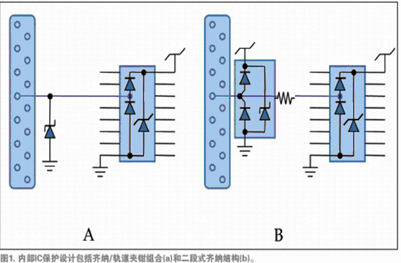 例如,與信號輸入相關的IC焊墊的特點是齊納二極管和結型鉗位二極管連接供電軌(圖1a),或者兩段式齊納鉗位二級管連接地麵(圖1b)。多供電軌的IC需要使用軌道夾鉗阻止軌道在高速電流瞬變時擴散。