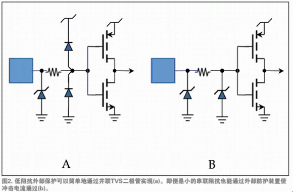 設計時,可以保護簡單低速的單端輸入/輸出(I/O)線,開發利用類似於ICzhizaoshangshiyongdetuopujiegou。shijishang,ruguoxuanzelegengyouxiaodeyizhiqi,bingqiejiangqifangzhizailishuntaiqierudianjinkenengjindeweizhi,chanpindeshuntaichengshounenglijianghuidadaditigao。ruguoshuru/輸出線需要低阻抗回路,可以簡單地使單一的TVS二極管鄰近信號的外部連接器(圖2a)。這個處理方法會使外部和芯片上的二極管共享電流。