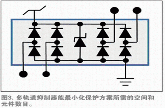 如果產品要在輸入/輸出線中承受某些額外阻抗(如在單端邏輯輸入時經常出現的情況),可以通過在外部夾鉗和IC引腳之間增加一個電阻器,使外部和芯片上二極管之間的電流有助於外部防護(圖2b)。一些TVS二極管供應商在單一小型組件包裏提供兩個結型二極管和一個TVS夾鉗,進一步減少組件數目、降低裝配成本,避免互連偏離。這些組件包同樣適用於多軌道情況——單一的組件包為幾條普通供電軌提供保護(圖3)。