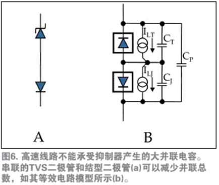 ,其中,CJ是結型二極管的斷開狀態電容(圖6b)。如果發生瞬態時複合設備正在運行,結型二極管正向偏置。特定峰值電流的耗損比TVSerjiguanzaixuebengmoshixiayunxingdehaosunyaoshaodeduo。jiexingerjiguandejiedianqujiqidianrongyegengxiao。yinci,jiexingerjiguandedianrongkezhipeilianggeerjiguandejishengchuanlian,bingqiejianshaolefuheshebeidezongtiduanludianrong。