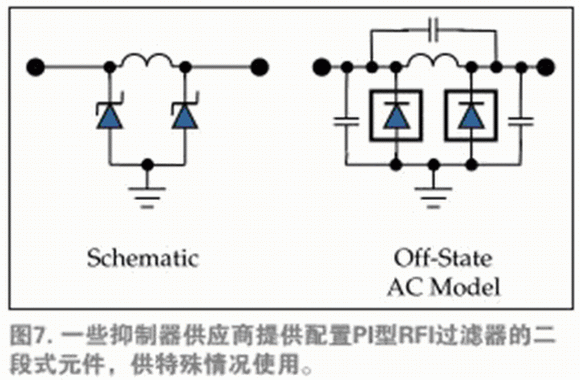 類似圖1b中的片上二段夾鉗結構也應用於外部夾鉗,在相同設備中同時實現瞬態超電壓防護和電磁幹擾(EMI)過濾。這種布局是基本的π形網絡,同時,TVS二極管的寄生電容有利於完成EMI過濾。電阻和感應網絡均可直接利用,滿足各種實體電路層對於信令的具體要求(圖7)。抑製器供應商通常按照通信標準在選擇器向導中對元件加以區分,確保適當的帶寬和某些特性阻抗的應用。