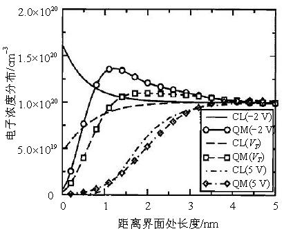 圖1給出了不同的柵壓下考慮多晶矽量子效應時多晶矽中載流子的分布和經典下載流子的分布,圖中CL為經典描述下載流子分布,QM為考慮量子效應下載流子的分布。體原封不動摻雜為1018 cm−3,多晶矽摻雜為1020 cm−3。當(dang)所(suo)加(jia)電(dian)壓(ya)為(wei)負(fu)電(dian)壓(ya)和(he)柵(zha)壓(ya)為(wei)閾(yu)值(zhi)電(dian)壓(ya)時(shi),量(liang)子(zi)效(xiao)應(ying)下(xia)的(de)載(zai)流(liu)子(zi)分(fen)布(bu)與(yu)經(jing)典(dian)的(de)情(qing)況(kuang)有(you)很(hen)大(da)的(de)差(cha)別(bie),而(er)加(jia)的(de)正(zheng)電(dian)壓(ya)很(hen)大(da)時(shi),量(liang)子(zi)情(qing)況(kuang)與(yu)經(jing)典(dian)情(qing)況(kuang)沒(mei)有(you)很(hen)明(ming)顯(xian)的(de)差(cha)別(bie)。這(zhe)是(shi)由(you)於(yu)在(zai)外(wai)加(jia)電(dian)壓(ya)為(wei)負(fu)時(shi),能(neng)帶(dai)的(de)突(tu)然(ran)變(bian)化(hua)對(dui)電(dian)子(zi)波(bo)函(han)數(shu)有(you)顯(xian)著(zhu)影(ying)響(xiang);而外加電壓為正的時候,對電子波函數影響很小。