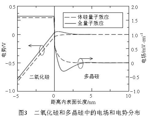 ,二氧化矽厚度為5 nm。可ke以yi看kan到dao考kao慮lv多duo晶jing矽gui量liang子zi效xiao應ying時shi氧yang化hua層ceng電dian場chang比bi不bu考kao慮lv多duo晶jing矽gui量liang子zi效xiao應ying時shi大da,這zhe是shi由you於yu偶ou極ji子zi的de產chan生sheng使shi電dian場chang發fa生sheng扭niu曲qu,增zeng加jia了le氧yang化hua層ceng中zhong的de電dian場chang,使shi得de在zai體ti矽gui中zhong的de載zai流liu子zi增zeng加jia,也ye就jiu意yi味wei著zhe多duo晶jing矽gui量liang子zi效xiao應ying會hui導dao致zhi閾yu值zhi電dian壓ya的de減jian小xiao。