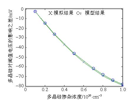圖4給出了不同的多晶矽摻雜下,考慮多晶矽量子效應相對於隻考慮體矽量子效應時MOSFET閾值電壓偏移的數值模擬結果與本文的模型結果。圖中體矽摻雜濃度為