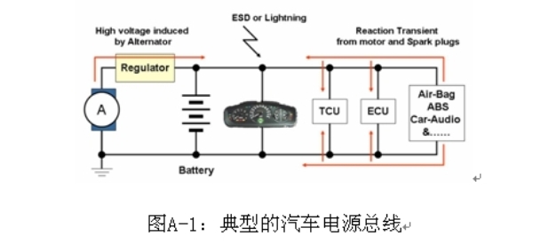 汽車電子,如電子控製單元、傳感器和娛樂係統,都是連接在一根電力線上。這些電子產品的功率來源是電池和發電機,兩者的輸出電壓都不穩定,會受到溫度、操作狀態和其他條件的影響。此外,由於這些係統使用了螺線管負載,如燃料噴射、氣門、發動機、電氣和水解控製器,ESD、尖峰噪聲和各種瞬變及浪湧電壓都會進入電源及汽車係統的信號線。