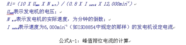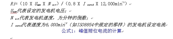 對於14 V係統的大型發電機來說,由以下ISO7637-2和ISO-8854的公式1)得出的220 A的發電機內阻為0.33 Ω,300 A型的內阻為0.24 Ω。