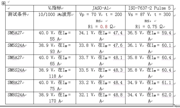 至少,兩個串聯的SM5S22A箝位負載突降電壓輸入為174 V,線路電阻為2 Ω,而SM6S22A或SM8S22A具有更低的箝位電壓和更低的線路電阻。