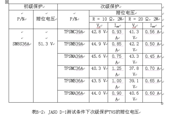 在24 V測試條件下,初級保護TVS的擊穿電壓如表B-1所示。這些將導致在穩壓器、儀表總成集成電路和其他電子設備上出現高電壓。