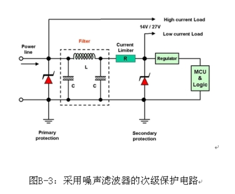 汽車係統中保護電路的初級目標是高電位浪湧電壓,但是箝位電壓仍然很高,如表A-1和B-1所示。次級保護對24 V傳動係統尤為重要,如在卡車和貨車當中。其主要原因是汽車應用中大多數穩壓器和DC-DC轉換器IC的最大輸入電壓是45 V至60 V。