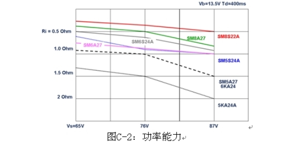 圖C-6是兩個串聯TVS的典型應用,圖C-7是各種線路電阻和電壓條件下兩個串聯的負載突降TVS的功率能力。