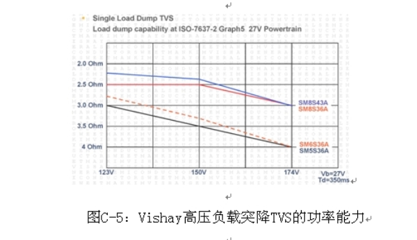 圖C-4考慮到了汽車電子中半導體的最大輸入電壓的約定是75 V的需求,某些Vishay負載突降係列可以滿足42 V電源係統的要求。