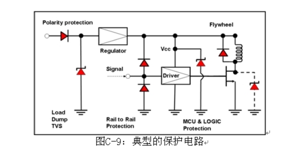 12 V電源係統中的極性反向規範習慣上通常允許在25℃條件下1分鍾以內為–2 V,而常用解決方案在汽車中每個電子單元的電源輸入線上使用一個整流器,以降低電流損耗,如圖C-9所示,這不適用於大電流應用。