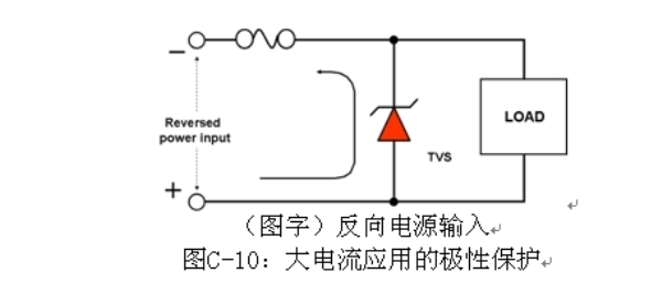 大電流應用極性保護的一種解決方案是使用高正向電流能力的整流器,或者是在電力線中使用沒有極性保護二極管的負載突降TVS,如圖C-10所示。
