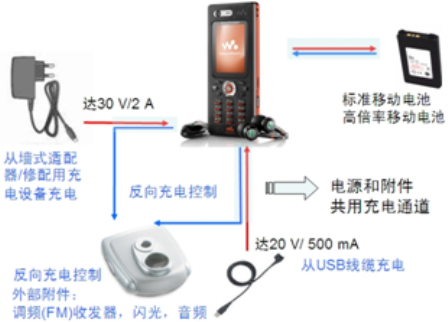 我們把普通牆式適配器或USB充電適配器到移動設備電池的通道稱為直接充電通道,而把移動設備電池到外部附件(如調頻收發器、負載揚聲器和閃光模塊)的通道稱為反向供電/充電通道(參見圖1移動設備的直接充電通道和反向供電/充電通道示意圖)。