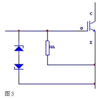 這時若集電極和發射極處於高壓狀態時,會使IGBT發熱,極易引起IGBT損壞。為防止此類情況發生,可在IGBT的柵極與發射極間並接一隻50~100歐姆的電阻,此電阻應盡量靠近柵極與發身極。如圖3所示。