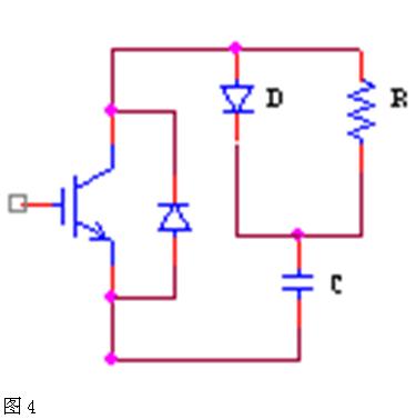為了使IGBT關斷過電壓能得到有效的抑製並減少關斷損耗,需要給IGBT主電路設置關斷緩衝吸收電路。IGBT的關斷緩衝吸收電路分為充放電型和放電阻止型,從吸收過電壓的能力上來說,充放電型效果較好,所以可在弧焊逆變電源中的IGBT過壓保護緩衝電路可采用圖4所示緩衝吸收電路: