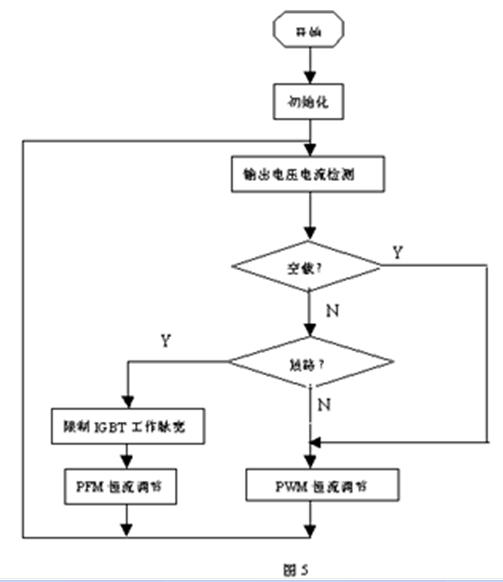 同時為保證輸出電流恒定,單片機在判斷輸出為短路時將逆變器的等脈衝寬度調節(PWM)變為頻率調節控製(PFM),即脈衝分頻控製,輸出電壓越低,輸出脈衝的頻率越低。其單片機程序過程如圖5所示: