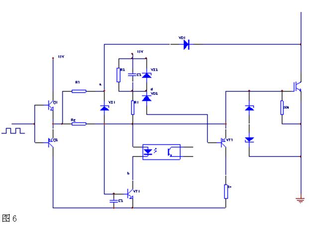 應設計保護電路為立即保護型。即保護電路動作後,切斷供電電源,停止逆變電源工作;最後,對元器件並沒有失效,而是由於某種其它原因如負載突然加大造成的過流,可嚐試采用一種慢降柵壓的電路來實現如圖6: