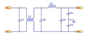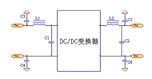 為了抑製外來的高頻幹擾,也為了抑製DC/DC變換器對外傳導幹擾,通過在DC/DC變換器的輸入端、輸出端設計濾波電路,抑製共模、差模幹擾,降低EMI電平。其中,C1、C2、C3為差模濾波電容,C4、C5為共模濾波電容,L1為共模扼流圈,L2為差模濾波電感。