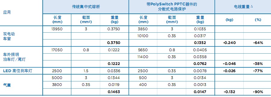 表1給出了與傳統熔斷保護技術相比,采用分散式架構和PolySwitch器件所能節省的重量。(注意,如前麵所述,本例中使用的最小電線規格為0.35 mm,而有些應用中可以使用規格更小的電線。)