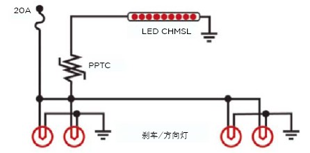 發光二極管(LED)所具有的低功耗和設計靈活性使其在照明電路中的應用日益普及,包括中置高位刹車燈(CHMSL)。在這種應用中用LED取代白熾燈的好處在於,能使用小規格低電流導線方便地在車頂內襯和靠近鉸鏈處不容易彎曲的連接中輕鬆地進行布線,如圖6所示。采用PolySwitch器件和分散式架構保護LED CHMSL照明應用提高了設計靈活性,減少了導線數量和重量並提高了可靠性。