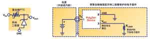 如圖2所示,聚合物增強型齊納二極管的微組裝集成了一個穩定的齊納二極管用於有效的電壓鉗位,阻值非線性的PPTC(聚合物正溫度係數)層。PPTC層對二極管加熱或過電流現象的響應是從低電阻態轉變為高電阻態。如果出現持續的大功率過壓條件,所啟動的PTC元件會限製電流並產生壓降,以保護齊納二極管以及後續的電子器件——有效地增加了二極管的功率處理能力。