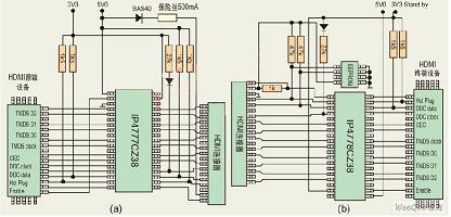 上麵兩個圖分別給出了HDMI源設備的高集成度解決方案和HDMI終端設備的高集成度解決方案的電路示意圖。
