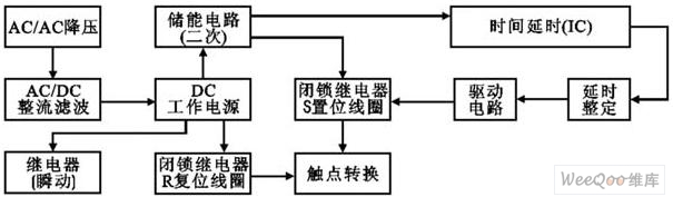 斷電延時繼電器整體構成包括斷電延時繼電器電源部分(經降壓、整流、濾波)以提供斷電延時繼電器內置瞬動電磁繼電器和2繞組閉鎖型R複位線圈工作);二次電源部分(供斷電後延時部分與2繞組閉鎖型S置位線圈工作);延時工作部分(可編程定時集成或CMOS計數分頻集成);驅動部分;執行繼電器部分組成(圖1)。
