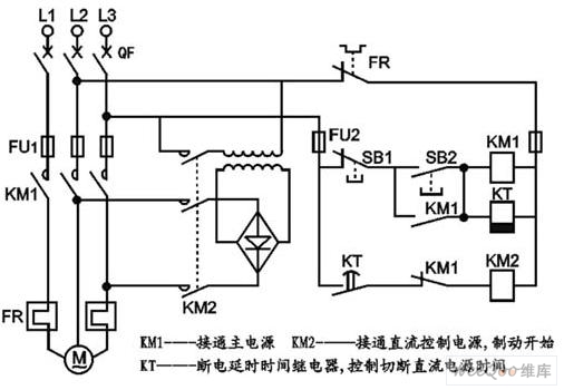 製動過程:按下停止按鈕SB1→KM1斷電,KM1主觸點斷開,電機脫離電源,KM1輔助常閉觸點恢複閉合,KM2通電,接入直流電源,製動開始,同時KM1輔助常開觸點又恢複斷開,則KT線圈呈斷電狀態,延時開始,待所設延時時間到達後,KT的延時斷開常開觸點恢複斷開,KM2失電,切斷直流電源,製動結束。