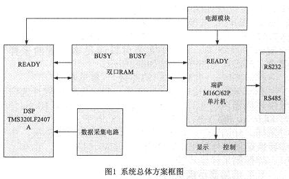 硬件平台是軟件算法的運行載體,是實現準確、高效選線的保障。本文設計的選線裝置采用雙CPU。即"DSP+單片機"的處理機構。DSP作為運算CPU,負責信號采集、選線計算部分;單片機作為管理CPU,主要負責人機交互部分。DSPchuliqiyouyuneibucaiyonghafozongxianjiegou,zhilingshiliushuixiancaozuo,yijidulideyingjianchengfaqijiegoudeng,feichangshihejinxingshuzixinhaochuli,jinxingshishideshujufenxihejiankong。benwencaiyongTI公司的TMS320LF2407A(以下簡稱LF2407A)DSP芯片為數據采集和處理CPU,充分利用其強大的數據處理能力和速度,實現多點數據采集和快速參數計算。單片機采用瑞薩M16C/62P係列單片機,該單片機具有很強的抗幹擾能力和1M的尋址空間,適用於事件管理和人機交互。係統總體方案如圖1所示。本保護裝置位於現場,進行數據采集和處理,並且與上位機之間進行通信。保護裝置采用M16C/62P單片機為主CPU,負責係統顯示、控製和與上位機通信;采用TMS320LF2407ADSP為從CPU,負責數據采集和處理;DSP與單片機之間用雙端口RAM進行通信。係統通過RS232和RS485與上位機通信。