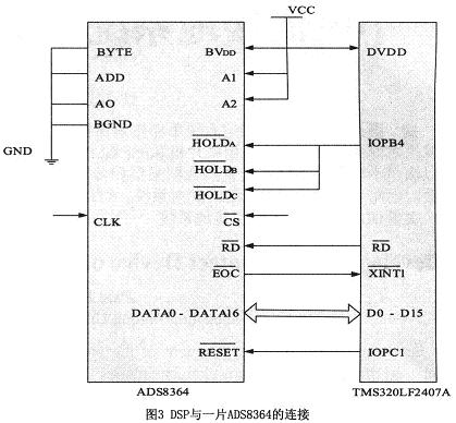 係統采用I/O接口啟動AD轉換。6片ADS8364的片選信號由譯碼器電路和IS、A15信號共同產生。通過IOPB4使得HOLDA、HOLDB、HOLDC同時為低電平,對6個通道同時采樣。AD的EOC引腳與DSP的外部中斷XINT1相連接,由AD轉換結束信號發出中斷請求,讀取AD轉換結果。由A0、A1、A2控製采樣模式。