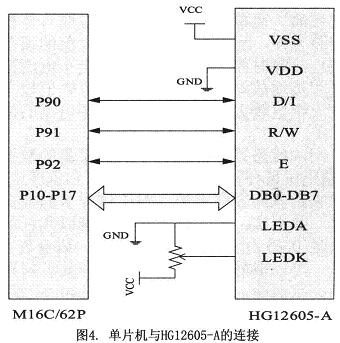 HG12605-A中內藏ST7920點陣式LCD控製與驅動芯片,可以顯示字母、數字符號、漢字、以及自定義文字符號。ST7920芯片內部集RAM和ROM、字型產生器、以及液晶驅動器和控製電路於一體,因此,隻要一個很小的處理係統,就可以操作HG12605-A液晶顯示模塊,並且硬件連接簡單。液晶模塊和單片機的連接如圖4所示。