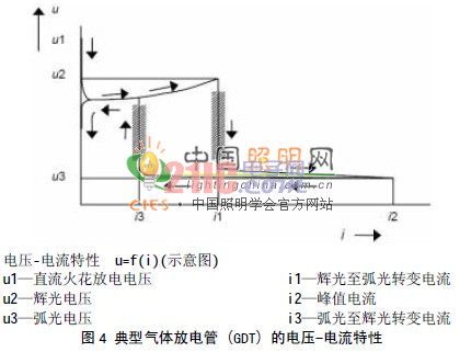 由於浪湧幹擾所致,一旦加在氣體放電管兩端的電壓超過火花放電電壓(圖4的u1)時,放電管內部氣體被電離,放電管開始放電。放電管端的壓降迅速下降至輝光放電電壓(圖4的u2)(u2在表2中的數值為140V或180V,與管子本身的特性有關),管內電流開始升高。隨著放電電流的進一步增大,放電管便進入弧光放電狀態。在這種狀態下,管子兩端電壓(弧光電壓)跌得很低(圖4的u3)(u3在表2中數值為15V或20V,與管子本身的特性有關),且弧光電壓在相當寬的電流變動範圍(從圖4的i1→i2過程中)內保持穩定。因此,外界的高電壓浪湧幹擾,由於氣體放電管的放電作用,被化解成了低電壓和大電流的受保護情況(u3和i2),且這個電流(從圖4的i2→i3)經(jing)由(you)氣(qi)體(ti)放(fang)電(dian)管(guan)本(ben)身(shen)流(liu)回(hui)到(dao)幹(gan)擾(rao)源(yuan)裏(li),免(mian)除(chu)了(le)幹(gan)擾(rao)對(dui)燈(deng)具(ju)可(ke)能(neng)帶(dai)來(lai)的(de)危(wei)害(hai)。隨(sui)著(zhe)浪(lang)湧(yong)過(guo)電(dian)壓(ya)的(de)消(xiao)退(tui),流(liu)過(guo)氣(qi)體(ti)放(fang)電(dian)管(guan)的(de)電(dian)流(liu)降(jiang)到(dao)維(wei)持(chi)弧(hu)光(guang)放(fang)電(dian)狀(zhuang)態(tai)所(suo)需(xu)的(de)最(zui)小(xiao)值(zhi)以(yi)下(xia)(約為10mA~100mA,與管子本身的特性關),弧光放電便停止,並再次通過輝光放電狀態後,結束整個放電狀態(熄弧)。