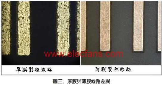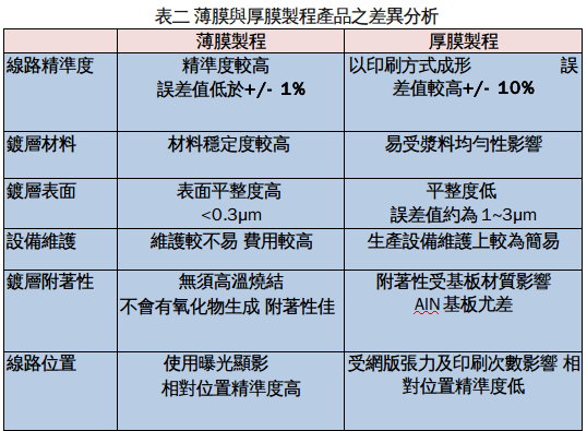 厚(hou)膜(mo)工(gong)藝(yi)大(da)多(duo)使(shi)用(yong)網(wang)版(ban)印(yin)刷(shua)方(fang)式(shi)形(xing)成(cheng)線(xian)路(lu)與(yu)圖(tu)形(xing),因(yin)此(ci),其(qi)線(xian)路(lu)圖(tu)形(xing)的(de)完(wan)整(zheng)度(du)與(yu)線(xian)路(lu)對(dui)位(wei)的(de)精(jing)確(que)度(du)往(wang)往(wang)隨(sui)著(zhe)印(yin)刷(shua)次(ci)數(shu)增(zeng)加(jia)與(yu)網(wang)版(ban)張(zhang)力(li)變(bian)化(hua)而(er)出(chu)現(xian)明(ming)顯(xian)的(de)累(lei)進(jin)差(cha)異(yi),此(ci)結(jie)果(guo)將(jiang)影(ying)響(xiang)後(hou)續(xu)封(feng)裝(zhuang)工(gong)藝(yi)上(shang)對(dui)位(wei)的(de)精(jing)準(zhun)度(du);再者,隨著元件尺寸不斷縮小,網版印刷的圖形尺寸與解析度亦有其限製,隨著尺寸縮小,網版印刷所呈現之各單元圖形尺寸差異(均勻性)與金屬厚度差異亦將越發明顯。為了線路尺寸能夠不斷縮小與精準度的嚴格要求下,LEDsanrejibandeshengchanjishushibiyaojixutisheng。yinerbomogongyidedaorujiuchengweilegaishanfangfazhiyi,ranerguoneiyongyouchengshudetaocijibanbomojinshuhuagongyijishudechangjiaquequzhikeshu。weici,yibomoyuanjianqijiade璦sibaidianzi(ICP),即針對自家開發之薄膜基板與傳統厚膜基板進行其工藝與產品特性差異分析(如下表二所示)。