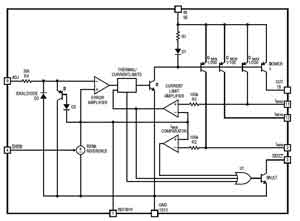 可編程短路檢測和電流限值在IMAX引腳上提供,而且該限值一旦設定,則其在整個電壓和溫度範圍內的波動幅度將小於5%。IMAX引腳是一個特別設計的電流反射鏡器件的集電極,可提供大約為輸出電流1/200的電流。該引腳同時也是精準限流放大器的輸入端。在IMAX和GND之間連接一個電阻器(RI(MAX)),用於設定短路檢測和可編程電流限製門限。限流放大器電路執行兩項功能。第一項功能是:如果IMAX引腳電壓達到600mV,則它將確定集電極開路/FAULT引腳邏輯電平。第二項功能是:它將調節輸出驅動電流以使IMAX引腳電壓不超過600mV,從而將輸出電流限製為0.6V•200/RI(MAX)。