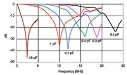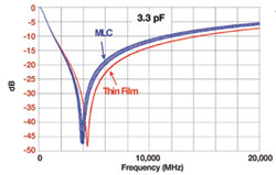 我wo們men必bi須xu認ren識shi到dao薄bo膜mo電dian容rong器qi用yong作zuo帶dai阻zu濾lv波bo器qi是shi具ju有you局ju限xian性xing的de。因yin為wei薄bo膜mo電dian容rong器qi通tong常chang隻zhi能neng提ti供gong小xiao電dian容rong值zhi,所suo以yi它ta們men局ju限xian於yu頻pin率lv相xiang對dui較jiao高gao的de帶dai阻zu濾lv波bo器qi設she計ji。如ru果guo涉she及ji到dao低di頻pin設she計ji,必bi須xu采cai用yong其qi他ta的de濾lv波bo器qi方fang法fa,通tong常chang是shi使shi用yong高gaoQ值的多層射頻電容器。