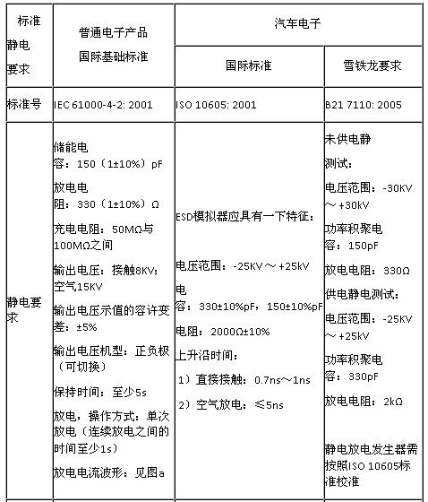 靜電問題對電子設備來說是必須考慮和預防的。為了防止電子設備在靜電幹擾時出現產生不必要的誤動作,因此各個國家、各行業也都對於相關的電子設備做出了靜電測試(ESD)要求。本文就以普通電子產品的國際基礎標準要求與汽車電子的國際標準(以雪鐵龍企業標準為例)做一比較。
