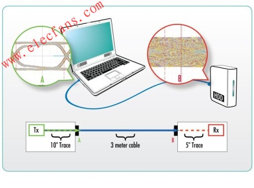 為滿足兼容性要求,USB3.0信號必須可以通過3米(mi)長(chang)的(de)線(xian)纜(lan),並(bing)保(bao)持(chi)信(xin)號(hao)眼(yan)圖(tu)開(kai)口(kou)有(you)足(zu)夠(gou)的(de)寬(kuan)度(du)。但(dan)這(zhe)隻(zhi)是(shi)部(bu)分(fen)的(de)路(lu)徑(jing),因(yin)為(wei)在(zai)兼(jian)容(rong)性(xing)測(ce)試(shi)中(zhong)測(ce)量(liang)的(de)是(shi)接(jie)收(shou)器(qi)經(jing)過(guo)均(jun)衡(heng)化(hua)處(chu)理(li)過(guo)後(hou)的(de)信(xin)號(hao)。舉(ju)例(li)來(lai)說(shuo),在(zai)一(yi)般(ban)的(de)筆(bi)記(ji)本(ben)電(dian)腦(nao)架(jia)構(gou)中(zhong),USB控製芯片到連接器的距離大約是10英寸,因此信號實際上可能另外經過大約半米的路徑和數個連接器。