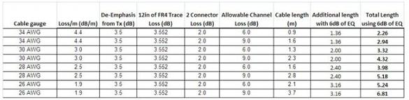 在一般的筆記本電腦至外圍設備的應用中,信號會經過長於12英寸的PCB線路(10英寸線路在筆記本電腦中,2英寸在接口設備中),這將導致3.552dB的線路損耗(12英寸x0.296dB/英寸,使用9/10/9FR4走線,2.5GHz信號速度,不包括任何PCB導通孔)。加上每一個連接器產生的-1dB損耗,通過兩個連接器產生的損耗一共是2dB,因此留給線纜的信號損耗預算隻剩下5.948~8.948dB。有遮蔽差分信號對線纜、2.50GHz速度的信號衰減大約是在34AWG的4.4dB/m到26AWG的1.9dB/m範圍內。表1列出了根據這些數字計算出的能符合USB3.0規範的SDP線纜的最大長度。表1中第三列到最後一列顯示,如果不使用信號調節產品,即便高質量的28AWG線纜,也無法達到USB3.0規範要求的3米長度。