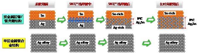 圖7 單金屬層Ag合金結構與雙金屬層Sn/Ag共熔結構,在SMT焊接前後及長時間使用後的材料與結構變化示意圖。