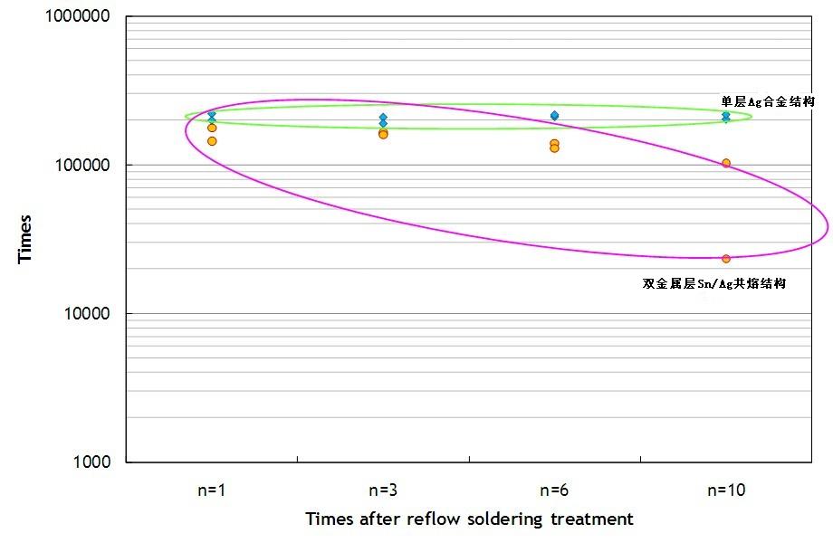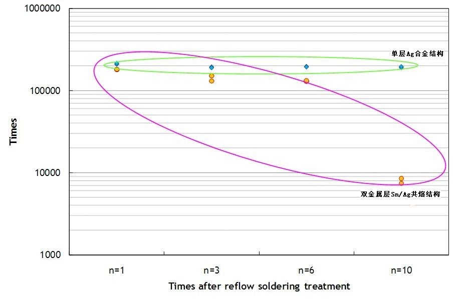 單層Ag合金結構的保險絲即使經過多次高溫熱處理,仍可以維持一定的耐脈衝能力,承受脈衝次數都可達十萬次以上。但是雙層Sn/Ag共熔結構的保險絲,其承受脈衝能力有明顯下降的趨勢,在經過10次回流焊錫爐熱處理後,承受脈衝次數就會下降到十萬次以下。