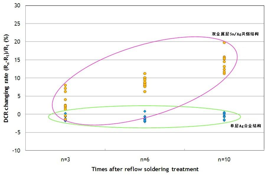 單層Ag合金結構的保險絲即使經過多次高溫熱處理,其冷阻抗變化很小。但是雙層Sn/Ag共熔結構的保險絲,其冷阻抗有明顯變高的趨勢(約升高10~20%),且變異也較大。