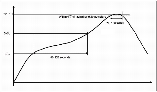 2.回流焊錫爐內溫度條件(圖2),最高溫245±5˚C/20±5秒,作業時間240±10秒。