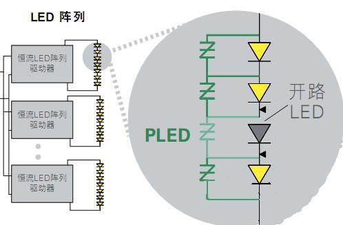 以上方案能夠有效的應對電源部分產生的浪湧威脅,保護LED免受損壞。但是我們都知道,LED燈等通常由一定數量的LED管串接或並聯組成陣列,單個LED損壞會造成的整個LED陣列的停止工作。因此在LED陣列端,LF專門為LED開路研製了PLED LED開路保護器,如圖所示: