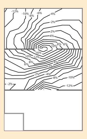 將探針B或C從源極焊盤中心向邊緣移動會導致較大的誤差。圖4顯示了移動探針B或C所產生的誤差。每條線表示RDS(on) 2%的誤差。在繪製這張圖時,使用了5μm×5μm的網格。每次隻移動一個探針的位置。