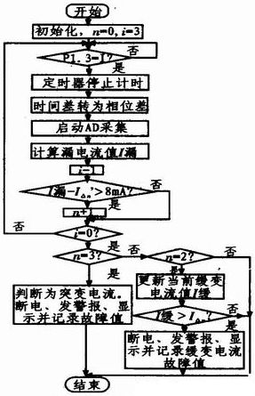 漏電流檢測的流程圖如圖3所示。漏電流信號過零點後,開始AD采樣轉換,根據定時器測得漏電流和工作電壓之間的時間差計算相位差,得到漏電流的大小,將連續3個周期同一時刻的值分別與突變電流和緩變電流的設定值作比較,判斷當前是否發生漏電;若漏電,漏電由緩變電流引起還是突變電流引起;若大於整定值則立刻斷電並顯示係統當前故障值並報警等。