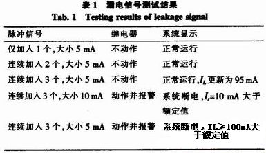 為wei了le測ce試shi需xu要yao,我wo們men設she計ji了le一yi個ge信xin號hao源yuan,可ke以yi按an照zhao係xi統tong檢jian測ce信xin號hao的de要yao求qiu產chan生sheng脈mai衝chong信xin號hao,以yi脈mai衝chong信xin號hao來lai模mo擬ni漏lou電dian信xin號hao。設she定ding緩huan變bian電dian流liu動dong作zuo值zhi為wei100 mA,突變電流動作值為8 mA,當緩變電流累計值達到90 mA時,測試結果如表1所示。