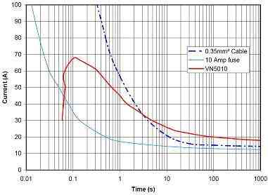 在圖3的示例中有一個點,智能開關 (VN5010)將繼續前行,而電線將開始自毀(紅線在藍色虛線上方)。如ru果guo這zhe種zhong情qing況kuang是shi真zhen實shi的de,甚shen至zhi連lian電dian路lu板ban都dou可ke能neng會hui自zi毀hui。現xian在zai考kao慮lv到dao湧yong流liu要yao求qiu很hen可ke能neng更geng加jia嚴yan格ge,我wo們men開kai始shi意yi識shi到dao有you必bi要yao開kai發fa一yi個ge能neng夠gou仿fang真zhen熔rong斷duan器qi特te性xing的de保bao護hu算suan法fa。